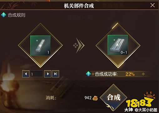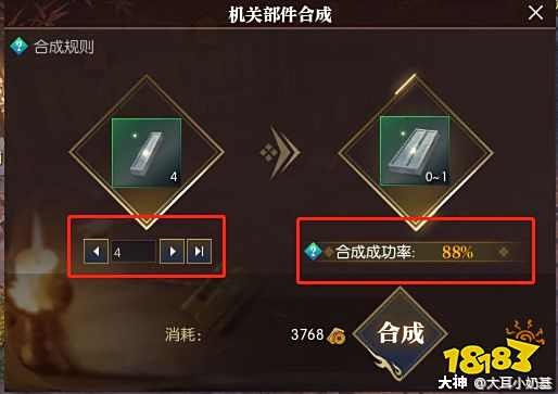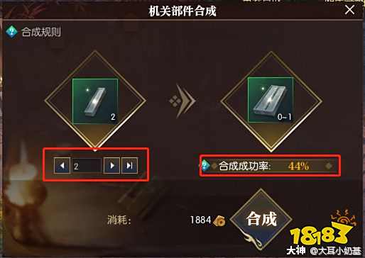 要想提高合成的成功率,可一次性多使用几个机关部件,使用的部件越多,成功率越高。建议合成二阶部件时取60%成功率;三阶部件取80%;四阶部件取80%以上,能大概率节省花费。当然,合成这玩意看脸,运气好的时候把把一手成也是有可能的,但是黑起来99%成功率也是会失败的,喜欢打铁的同门对这点肯定深有体会!切忌上头!切忌上头!切忌上头!