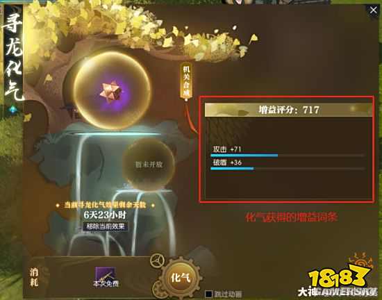 将机关放入庄园组件【龙楼宝殿】中进行“寻龙化气”,角色将获得部分机关的属性增益,注意是部分属性噢!假如说放入【龙楼宝殿】的机关属性有“词条A、词条B、词条C”,那么化气获得的属性增益则可能是3个词条中的任意1个或者2个,要想获得3个那就是看脸的事情了。每周前2次化气免费,更多次数需要使用【寻龙尺】,刷新1次,持续7天。