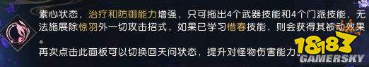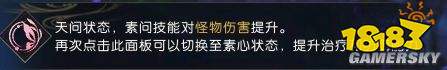 素问拥有两种姿态素问模式下,治疗、战复、加血、驱散、增益、减伤等各种远程辅助技能。亦可切换天问模式,控制、输出、加血、战复等各种远程输出技能。
