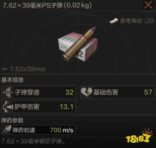 子弹穿透32、基础伤害57、护甲伤害13.1,弹药速度700m/s。