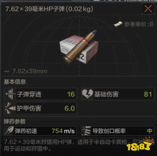 子弹穿透16、基础伤害81、护甲伤害6.0,弹药速度754m/s。