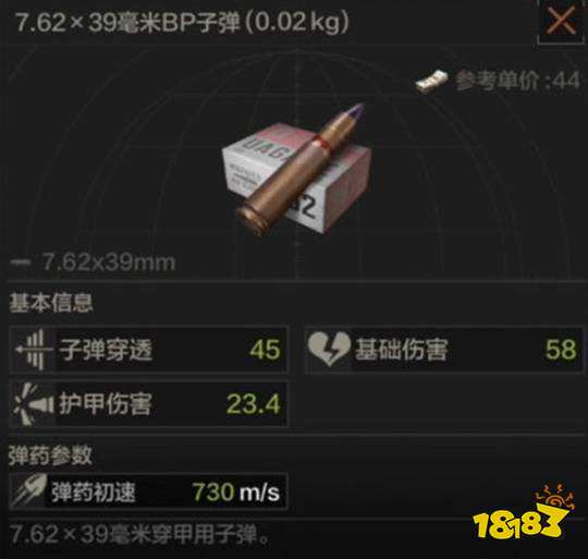 子弹穿透45、基础伤害58、护甲伤害23.4,弹药速度700m/s。
