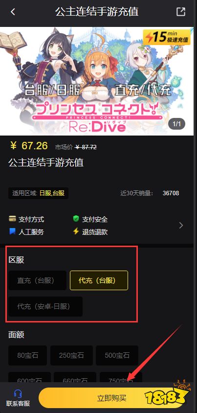 3、第三步:选择区服及面额,目前只有台服可选,日服由于特殊原因暂无充值渠道