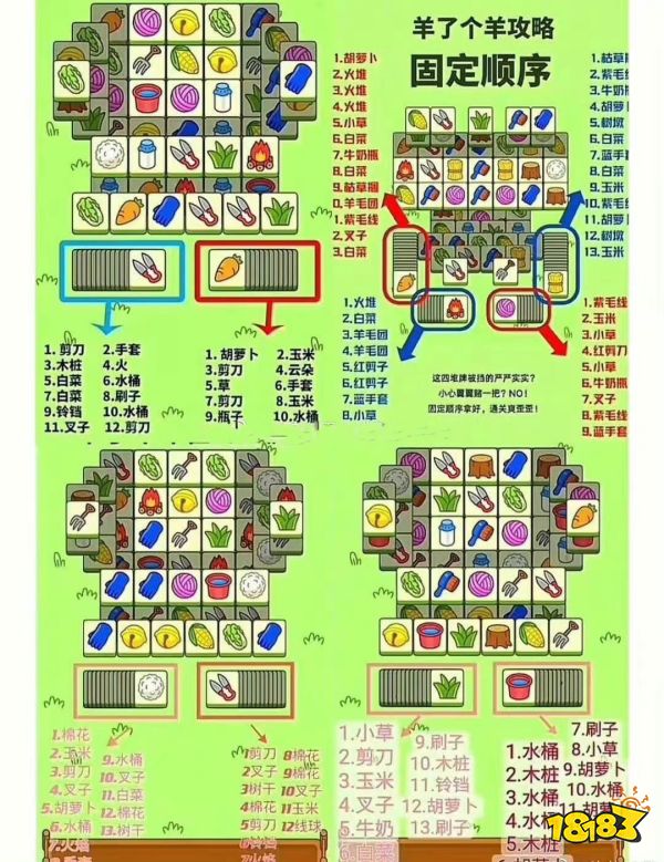 羊了个羊第二关顺序图包含了多个地图的固定顺序,每一次进入关卡都是完全随机的,其中包含了多个游戏地图,当你随机到这几个地图的时候就可以进行使用了,如果不是以下地图的话,可以直接重新开始,一直随机到正确地图,然后按照图中的顺序就能让快速通关。