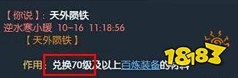 逆水寒天外陨铁在玩家兑换70级百炼装备的必要消耗材料,当然还需要寒光令、百炼令,分解70级以上的红色武器可以获得天外陨铁。