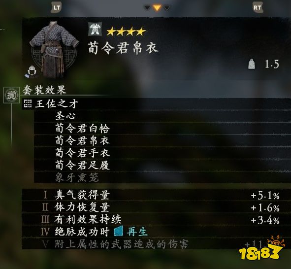 卧龙苍天陨落荀彧的套装效果是王佐之才,一件增加真气获得量,两件增加体力回复量,三件增加有利效果持续,四件在绝脉成功时可以再生,五件附上武器伤害。
