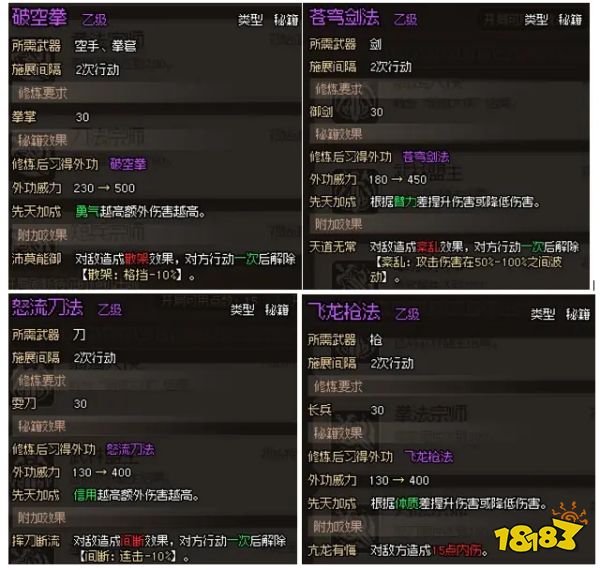 破空拳、苍穹剑法、怒流刀法、飞龙枪法