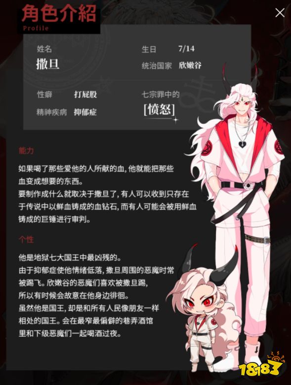 地狱有什么不好撒旦是统治欣嫩谷的君主,代表七宗罪中的愤怒,生日是7月14日,有抑郁症,他是地狱七大国王中最凶残的,能把那些爱他的人所献的血变成想要的东西。