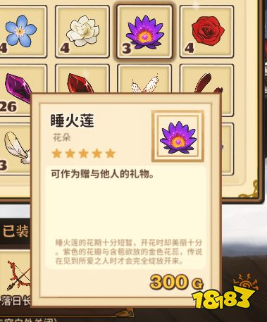 睡火莲可以送给任一NPC,统一加的好感值都是5点,也没有差分对话,想要刷好感又不想思考的玩家,睡火莲是一个很好的赠礼选择。