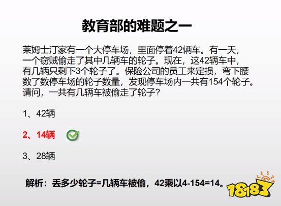 崩坏星穹铁道教育部的难题之一选择2、14辆,因为被偷的车只剩3个轮子,所以丢了多少轮子就是有多少辆车被偷,一辆车4个轮子,42×4-154=14。
