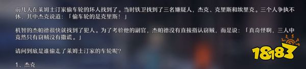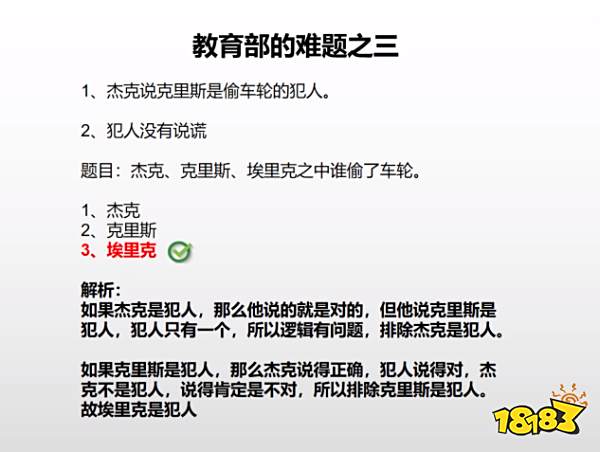 崩坏星穹铁道教育部的难题之三答案是3、埃里克,因为假如杰克是犯人的话,那他就说谎了,与题干矛盾,同理如果克里斯是犯人,那杰克不是犯人肯定说谎了,与题干矛盾,所以埃里克是犯人。