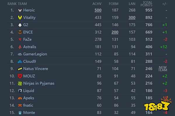 G2如今位列第三名,他们取代了FaZe的位置,和Vitality的积分差距也明显缩小。上个月他们和Vitality的差距高达400分,现在已经是100多点。随着Top1争夺的加剧,G2也有希望掀翻Heroic。