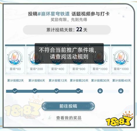 崩坏星穹铁道不符合当前推广条件的解决方法是点抖音下面的加号发视频,自己手动带个#崩坏星穹铁道话题,这样也会算天数的,不过崩铁发视频打卡领星琼的活动是先到先得,大家尽量每天都打卡哦。
