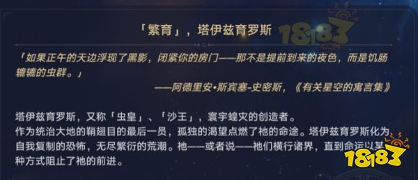 作为统治大地的鞘翅目的最后一员,孤独的渴望点燃了祂的命途。塔伊兹育罗斯化为自我复制的恐怖,无尽繁衍的荒潮。祂一一或者说一一祂们横行诸界,直到命运以某种方式阻止了祂的前进。