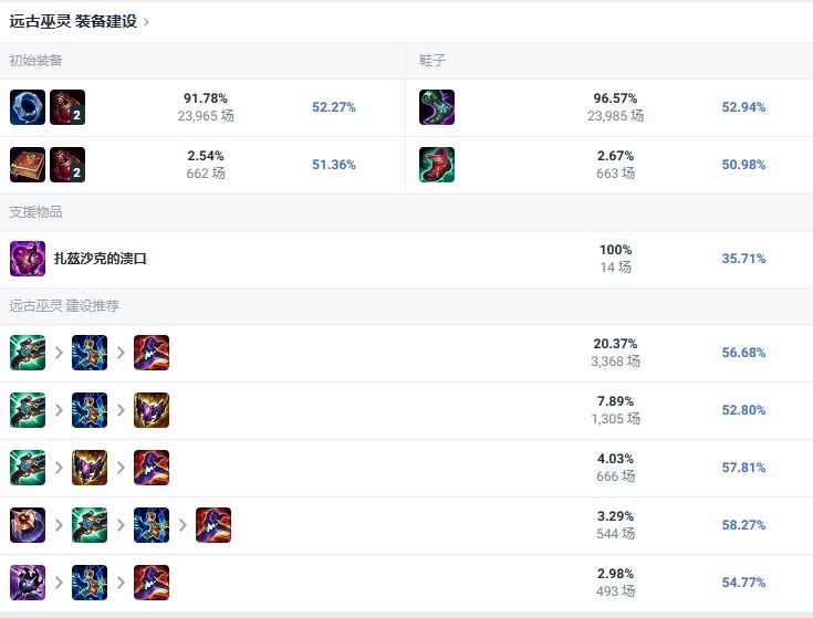 2024的LOL更新到了14.11版本,远古巫灵目前在中路因为手长的优势,也变得很强力。这个英雄第一件推荐科技枪来增强续航,第二件出为远古巫灵量身打造的视界专注,也可以看情况出影焰。第三件一般都是出帽子来增加输出。
