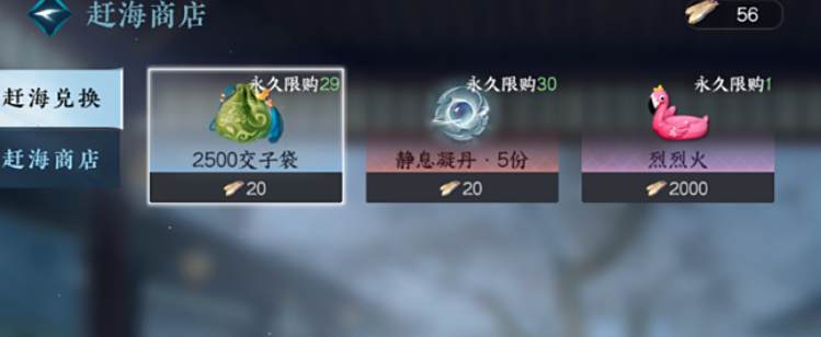 4、有一定蛏子后就找贺漱石进行海产交易,在赶海商店兑换道具,赶海用盐使用一次获得3-5个蛏子;铲子需要40个蛏子兑换(建议尽早兑换)高概率获取皮皮虾(20个蛏子)和螃蟹(10个蛏子)。