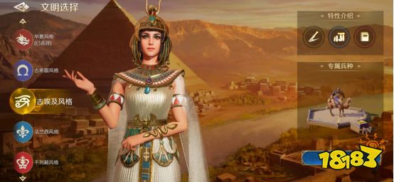 首次进入游戏后,玩家首先需要在华夏、古希腊、古埃及、法兰西和不列颠五个文明中任选其一,作为自己的初始文明。不同文明也拥有专属的文明特性和特色兵种。