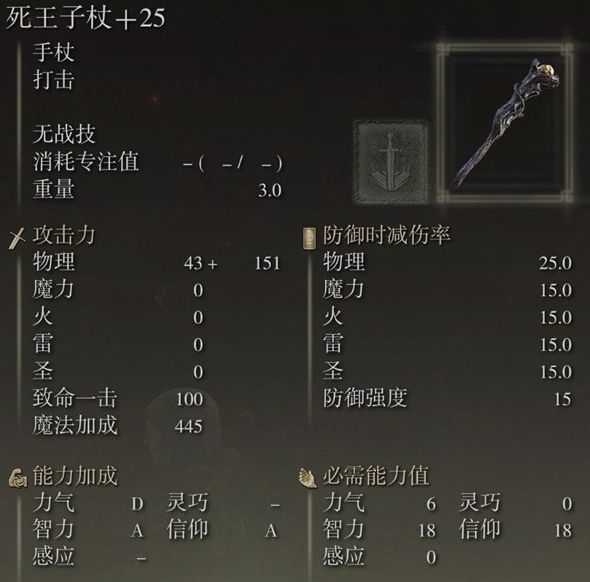 主手还没有取得DLC的新武器母亲杖之前先用死王子杖,使用普通锻造石升到25级,不需要装备任何战灰。
