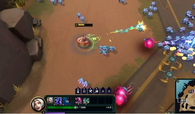 在无尽狂潮模式中,英雄的技能略有不同。例如,金克丝的普通攻击是她在《英雄联盟》中的基础攻击的升级版,机枪形态的攻击,但可以在射程内造成AOE的穿透伤害。当你达到三级时,会解锁金克丝的第二个技能——鱼骨头,这个技能可以向目标区域发射多枚火箭并在撞击时爆炸,非常适合在被困住时逃生,也是前期发育的手段。