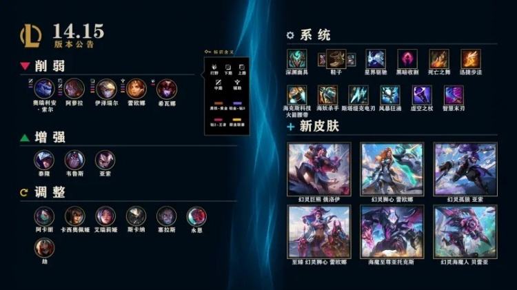 LOL在8月1日凌晨0点全区停机维护发布14.15版本,预计停机时间为0:00-12:00 。对于在停机期间结束的活动,其实际结束时间也将提前至停机维护开始时,敬请留意!这次更新对鞋子、海妖、EZ等内容进行了调整,感兴趣的可以查看下方内容。