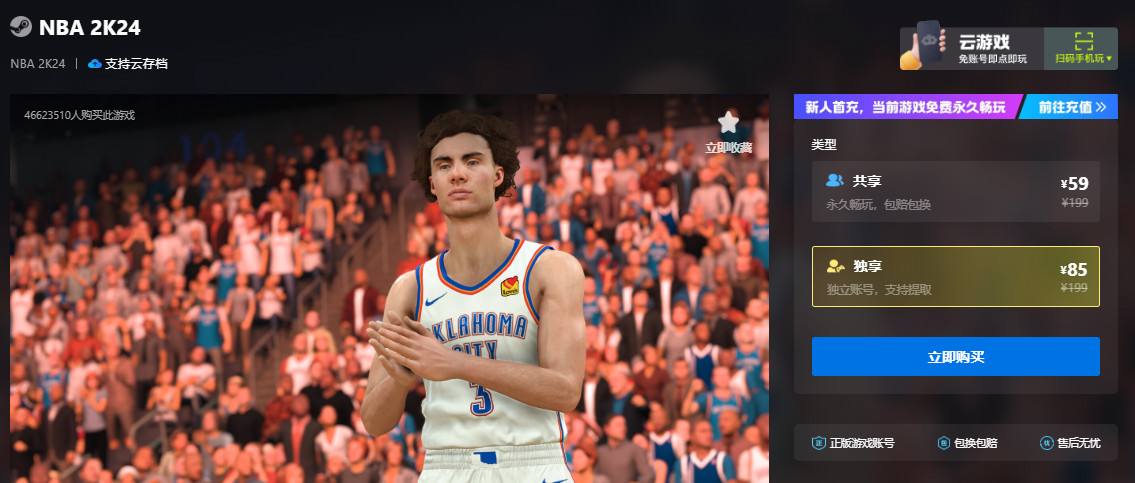 《NBA 2K24》是由2K Games开发并于2023年9月8日发行的最新篮球模拟游戏,登陆PS5、PS4、Xbox Series X|S、Xbox One、Nintendo Switch和PC平台。作为《NBA 2K》系列25周年的纪念作品,本作以传奇球星科比·布莱恩特为封面人物,并引入多项创新技术,如ProPLAY动态捕捉系统、跨平台联机功能,以及全新的“曼巴时刻”模式,让玩家体验更真实的篮球竞技。2024年3月,该作加入XGP游戏库,玩家可免费畅玩。