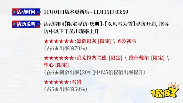 每日免费单抽:活动这 15 天里,每天都能在「以风雪为誓」卡池免费抽一次,凌晨 4 点刷新,漏了可补不回来,设个闹钟准没错。