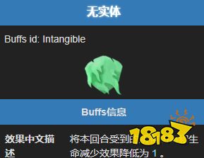 状态类型为通用 BUFF,玩家和敌人都可拥有,且可叠加。效果机制方面,拥有无实体状态时,本回合内受到的所有伤害和生命减少效果都会被降低为 1 点。可叠加,层数代表持续回合数。这是游戏中最强大的防御效果之一。