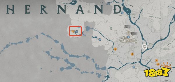 接下来打开游戏地图,定位到埃尔南德城,寻找地图字母 A 正下方的区域。该位置有一个明显的瀑布,周围伴有岩石和树木作为标记。