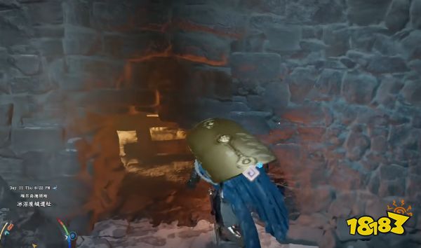 前行找到下楼梯通道,下楼后玩家就可以看到一个低矮洞口,请注意观察周围环境。