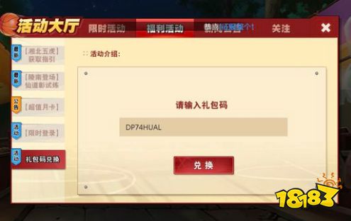 篮球手们可在活动-福利活动中输入【DP74HUAL】兑换相应补偿道具奖励