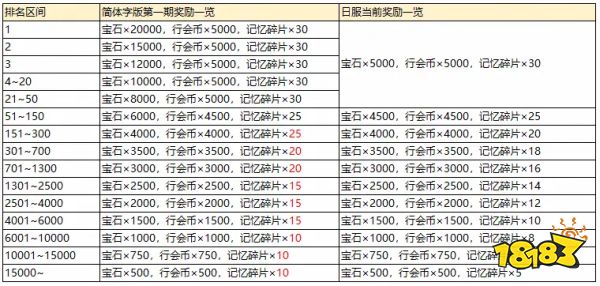 国服经过调整后,排名奖励已与日服不同,具体数据见下图: