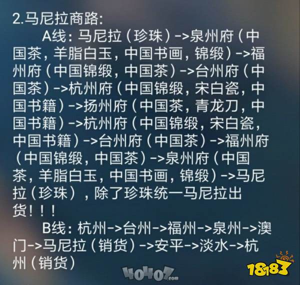 2.中国亚洲圈跑商(中朝贸易可应对跑中国无钱返回)+刷黑市(买跑商必备幽灵、沙漏、走.私证,挖遗迹必备炸药、抗疲劳以及好感物品等)+挖遗迹(日本商船材料、朝鲜战船材料)+商船水手改货仓