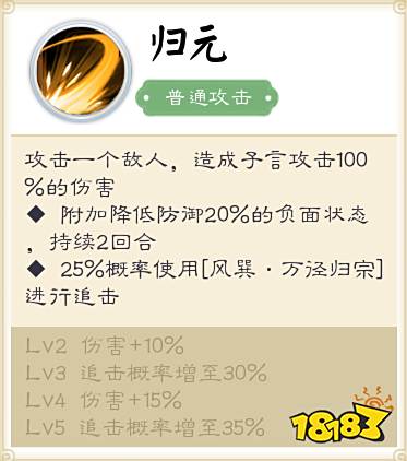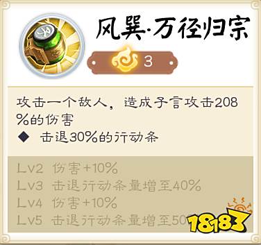 子言攻击一个敌人,造成攻击100%的伤害。附加降低防御20%的负面状态,持续2回合。25%使用[风巽·万径归宗]进行追击。