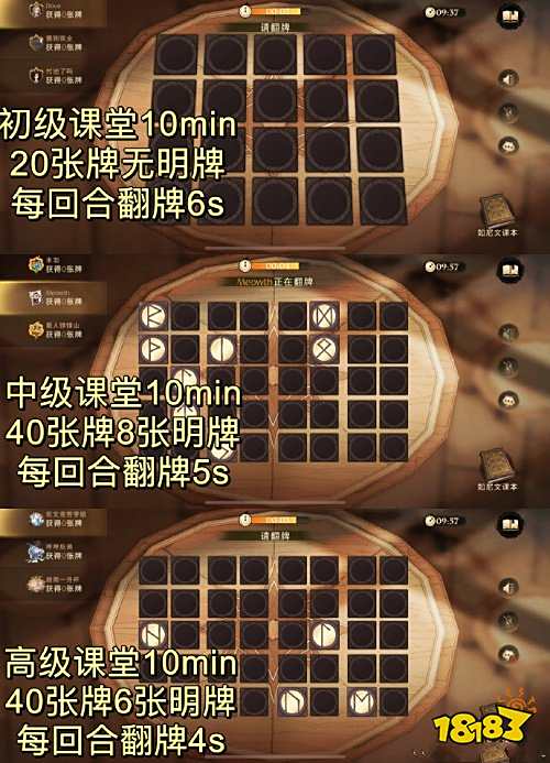 哈利波特魔法觉醒古代如尼文课玩法攻略:个人积分战,3人一组开启游戏,每局10分钟,每人按照顺序轮流翻牌,每回合可以翻两张牌,翻到的两张牌牌面相同,可拿走两张牌并累计得分,同时再获得1回合翻牌机会,翻到的两张牌牌面不同,两张牌回归原位,由下一位参与者翻牌。
