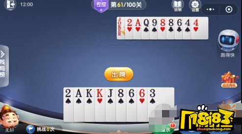 攻略:我方优势是拥有从3到Q的顺子,所以可以按照“从大到小”的方式出牌。另外,我方有【JJ】来牵制电脑的【AA】。