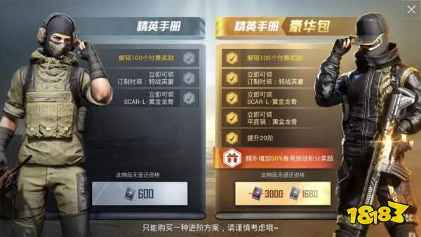 赛季手册进阶时可在普通精英版手册和精英版手册豪华包中进行选择,两种进阶方案只能选择一种,购买普通精英版手册后,将无法再购买精英版手册豪华包,各位选手要慎重选择哦~