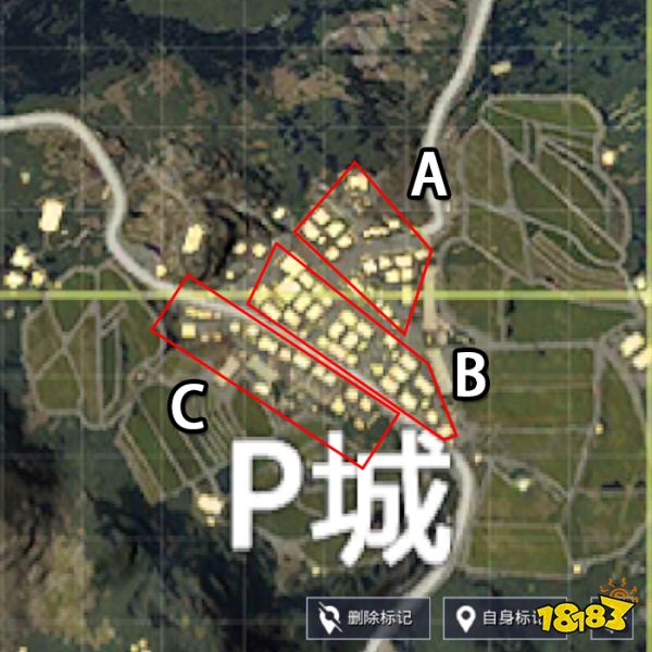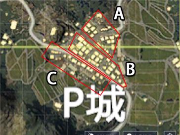 一般的玩家跳伞都会集中在A和B区域,因为P城的房区都是一块一块分布的,基本每一块都会有玩家落。而且P城是游戏中老阴比最多的地方,如果没有一副好的耳朵,一副好的耳机,加上好的反应能力,在P城的中心城区想要活下来是很难的,所以A和B区域我们直接放弃,我们选择生存率最高的地方。这里建议大家选择C区域的东头作为落地点,这个位置基本是不会有人的。