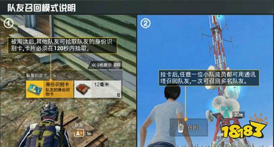 其实这个玩法跟正常的经典玩法没有太大的区别,只是队友被淘汰后,在规定的时间(120s)捡取盒子里的身份识别卡,然后全队任意存活的队友都可以在通讯塔这里召回队友,让队友复活再次参加游戏里的战斗!