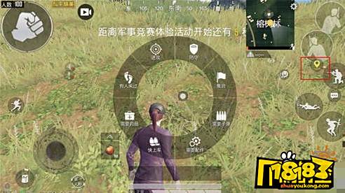 在右上角的一个小水滴形的按键就是标点圆盘,按住它不放,就可以打开标点圆盘了。有进攻,防守,集合,需要子弹,需要配件,快上车,需要药品,有人来过8大功能。注意的是,要一直按住不放 ,中间有一个小白点,按住水滴形状的按键移动可以移动百点,白点拖到指定区域使用功能。