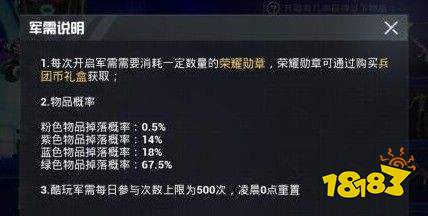 目前军需的价格是1次8元,10次72元,相比之前的是1次6元,10次54元,价格上贵了不少,但是质量很高。还有一点需要注意,这次军需新增了粉色品质,而快乐主宰人物皮肤和降落伞都是粉色品质的,粉色品质的开出率更低。以下是这个军需的所有品质开箱率,大家可以参考一下。