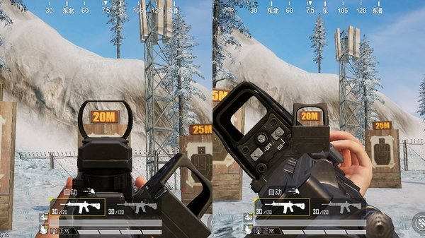 在训练营中小编拿20米距离的靶位来进行对比,在同样的位置下,侧面瞄镜开镜后看到的画面要比红点全息小一倍,并且还会因为同时使用两种倍镜的原因遮挡一定的的视野,所以测瞄准镜搭配红点或全息可以说是完全没有必要,得不偿失。