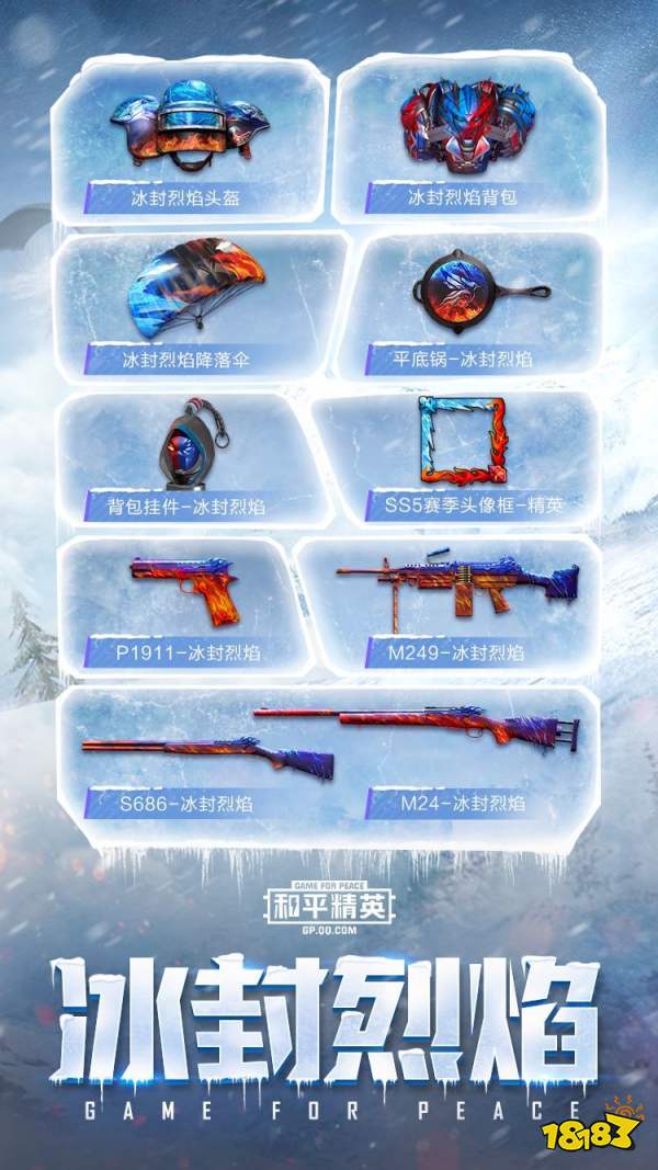 冲锋的号角已经吹响,在这个冬季里特种兵将面对极寒的挑战,SS5赛季赛季手册皮肤必定能让特种兵们战胜严寒,成就全新的自我!除此以外还有冰封烈焰系列枪械皮肤、背包、头盔、降落伞等极具特色的装备外观。