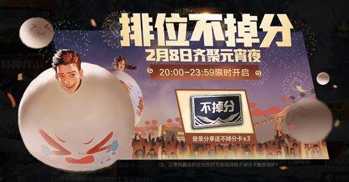 活动是在2月8日的20:00-23.59这段时间开启,在活动进行时,玩家分享游戏给好友即可获得3张不掉分卡。玩家在2月8日的20:00:00到23:59:59,开启排位竞赛(经典模式或召回模式),如果正常结算总积分时积分为负,系统将自动消耗不掉分卡触发不掉分保护,看上去这个奖励还是很值的。