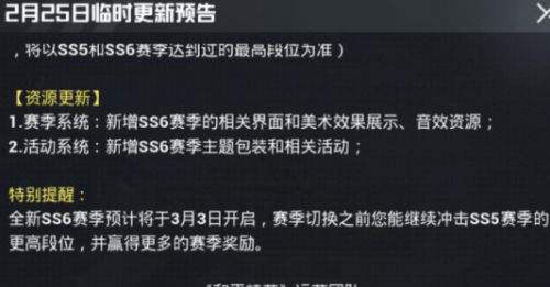 那么根据官方的系统说明来看,ss6赛季的更新时间基本确定在3月初,那么ss6赛季上线的时间很大几率会在3月中旬。玩家心心念念想要的新套装可能还需要等待一段时间。