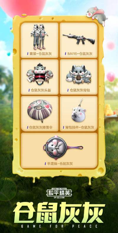 降落伞皮肤是圆形的,上面印着一个仓鼠图案,比者“耶”的手势,特别Q萌,周围还散发着爱心。