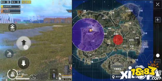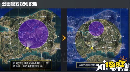 我们先来看一下游戏的基础机制,一开始会有一个白色圈,还有一个紫色的圈,正常的游戏一开始地图上所有的位置都是在信号接收区内的,但是圈中圈模式中,在紫色的圈内就等于在信号接收区外,进去就会降低信号值,而且这个紫色的圈降低的速度就等于是下一个圈的降低速度,要比我们想象中的更痛。