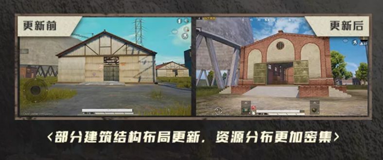 核电站区域重做,建筑结构布局更新,资源更加密集,战斗更加富于变化;优化矿场地形结构,调整建筑布局,新增7个大型仓库,增加跳伞落点,打野选择+1;监狱区域地形结构调整,周围新增更多围墙,部分建筑布局调整,让刚枪多了新的选择;增加若干野外资源点;