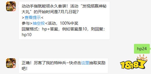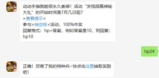 活动“动动手指就能领永久套装!活动“发视频赢神秘大礼”的开始时间是7月几日呢?这是和平精英2020年7月28日微信公众号上的答题抽奖活动的题目,大家回答正确即可获得1次抽奖机会,不清楚今天的答案的玩家,下面小编带来了2020年和平精英7月28日答题抽奖答案,一起来看看吧。