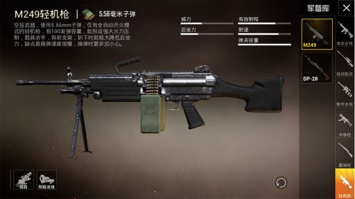 游戏中大家相信都用过了,M249的缺点在于只有除了瞄准镜之前没有什么配件,大家基本没有什么办法进行多种搭配,无法通过握把来提高其他属性。加上后坐力巨大,就算装上了倍镜,中远程作战的能力也是十分弱。