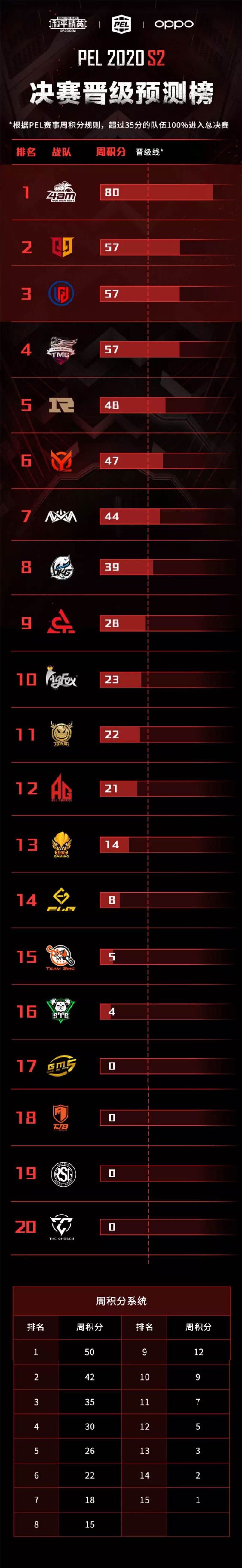根据PEL 2020 S2 赛事周积分规则及穷举计算,目前已有多支队伍确定晋级总决赛: